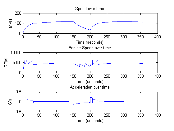 Basically it is the G35, starting from a standstill on a hill, accelerating as fast as it can up and over, hitting the brakes really really hard, turning around, and going fast up the hill again. In the velocity plot you can see the acceleration and braking regimes pretty clearly. In the engine speed plot the up and down shifting points are pretty clear as well. On the acceleration plot the drops you see are from a 1/10th of a second shift delay. There are some unrealistic assumptions involved there (no tire slip, infinite tire grip, capable of applying max torque at all engine speeds, ect.), but it is a step in the right direction.