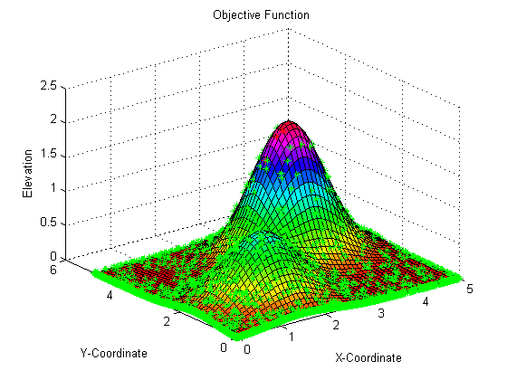 Here my algorithm is shown. The mess of green stars are the instances where the algorithm ‘jumped’ to a new spot, and found that it was lower than the previous point, so it turned back. The correct progression is shown in red, and pretty much impossible to see due to its randomness. This algorithm correctly identified the true maximum of the function, but it took 256ms in MATLAB, significantly more than the stochastic method.