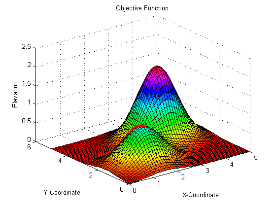 Here the stochastic hill climbing algorithm quickly and directly rises to the top of the wrong peak. In MATLAB, it only took 7ms to come to this admittedly wrong conclusion.