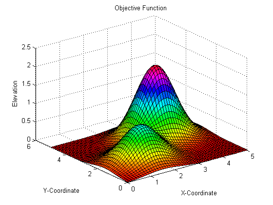 In this case I used a surface with 2 peaks. A common problem with hill climbing algorithms is getting stuck on the ’local maxima’ or that shorter peak. If it wasn’t already apparent, the point is to try to find the highest point on this surface.