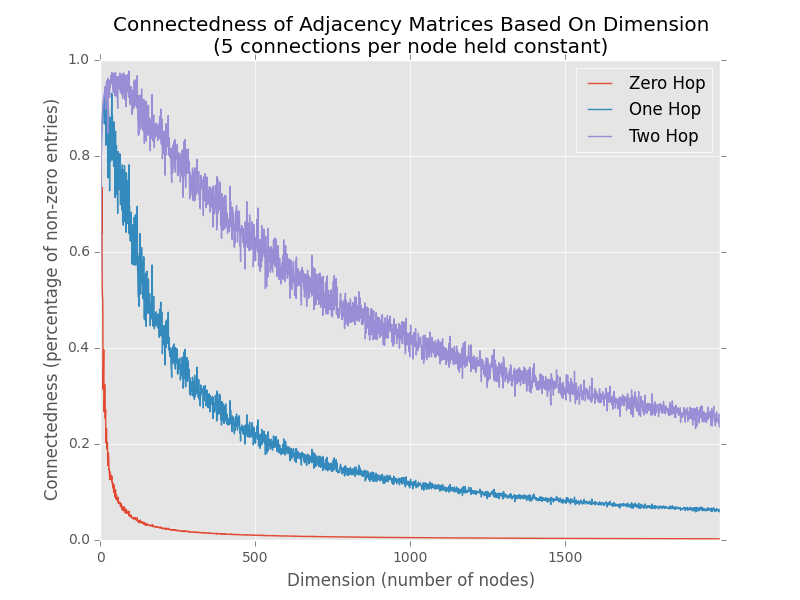 We kept the average number of edges per node approximately constant by setting the density of the initial randomly generated matrix. We then calculate the density of the initial (zero-hop), two hop, and three hop graphs.
